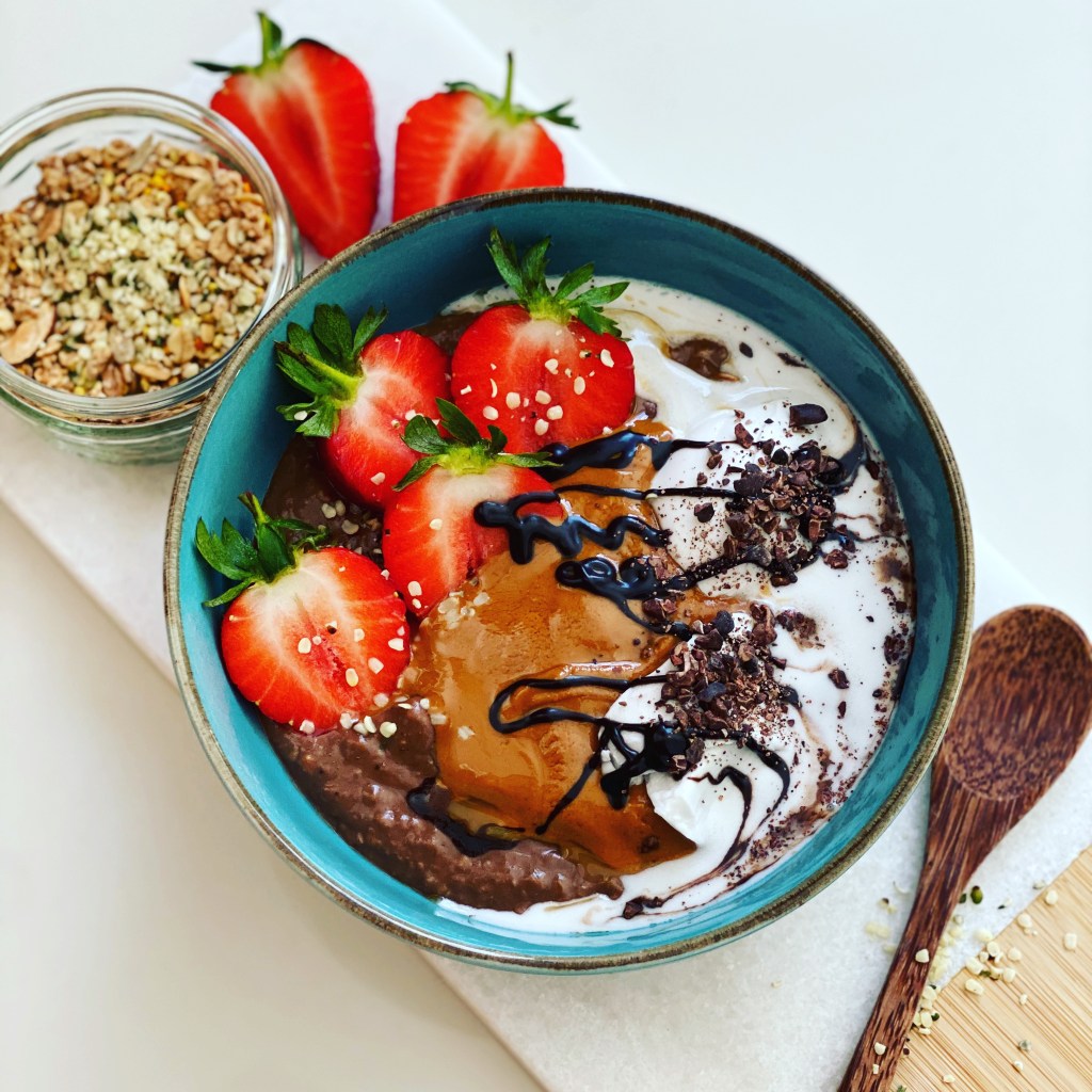 Blend all the ingredients for the cacao smoothie so, nice a thick and creamy. In a Saucepan add some Organic Oats and a some plant based milk then, add cacao smoothie once cooked and off the heat. Top with coconut cream, nut butter of your choice and strawberries, hemp seeds, homemade granola and chocolate shot………………..